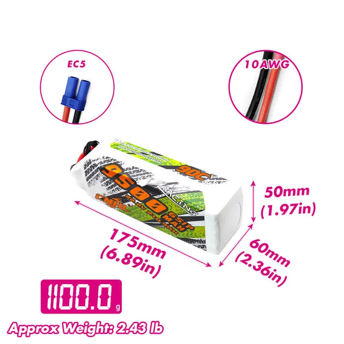 Package includes: 1 pack of CNHL Racing Series 9500mAh 22.2V 6S 90C Lipo Battery with EC5 Plug
