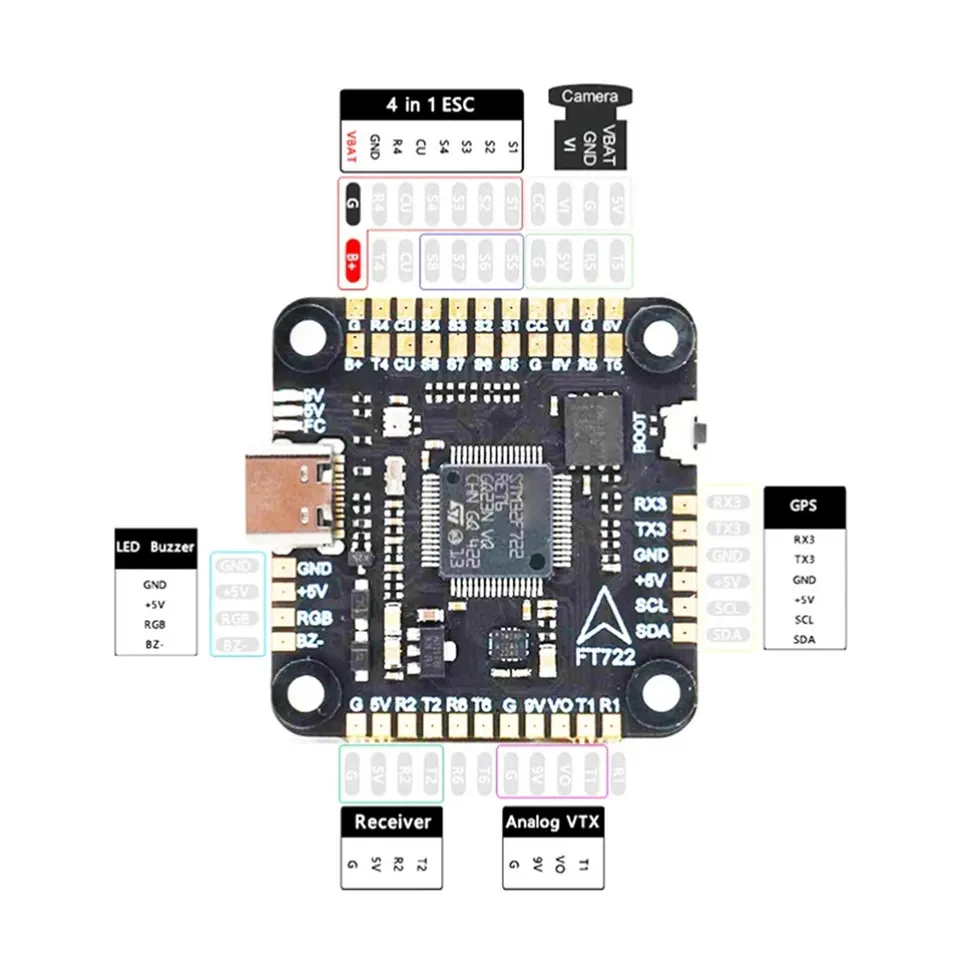3. The F722 is a 3-8S 36x36mm mini controller with a 16MB flash memory, 5V 10V dual BEC. Designed for easy maintenance and low interference.